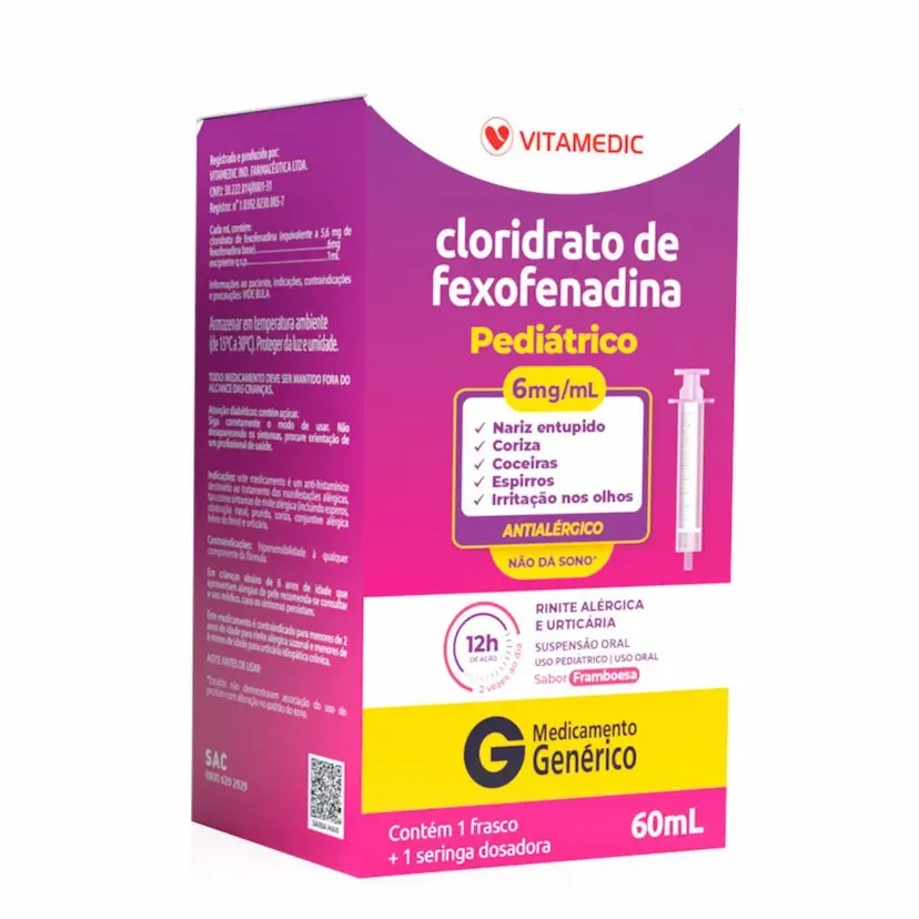 Apresentado em solução oral com 60ml, cada mililitro contém 6mg de fexofenadina, proporcionando alívio rápido e seguro para crianças. Conta com sabor agradável, facilitando a administração.