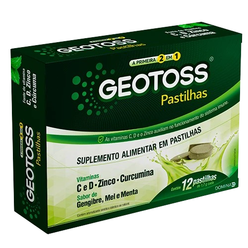 O Geotoss Pastilha C/12 é um suplemento formulado com cúrcuma, gengibre, mel e menta, ingredientes naturais conhecidos por suas propriedades antioxidantes e anti-inflamatórias.