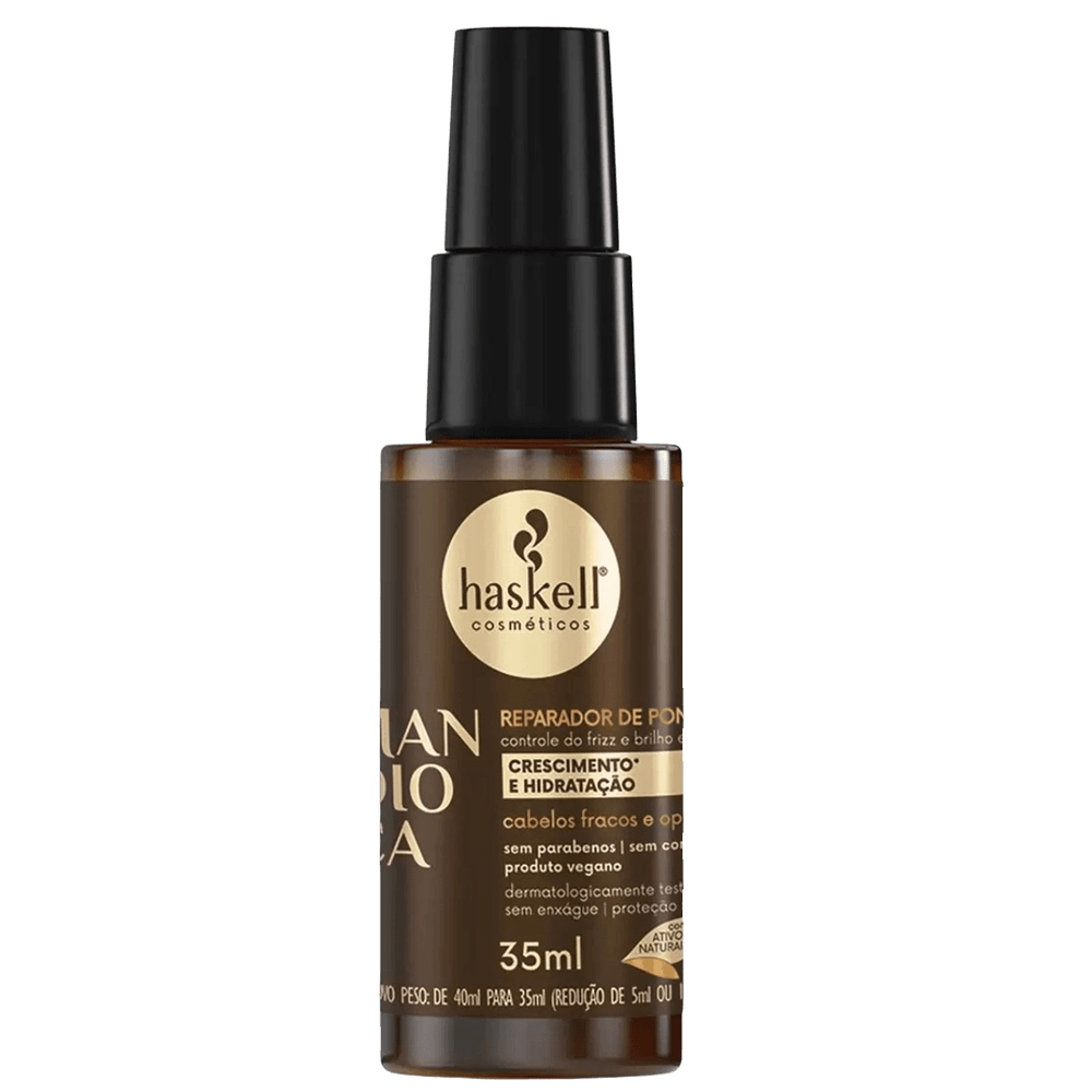 O Reparador de Pontas Mandioca Haskell 35ml é um produto desenvolvido para proporcionar maciez, brilho e hidratação aos cabelos, especialmente os fracos e opacos. Ele ajuda a prevenir pontas duplas e controlar o frizz, promovendo um acabamento saudável e alinhado.