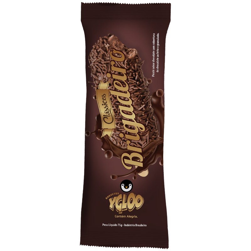 Picolé com sabor acentuado de chocolate, com cobertura de chocolate ao leite e chocolate granulado. O legítimo picolé de brigadeiro!