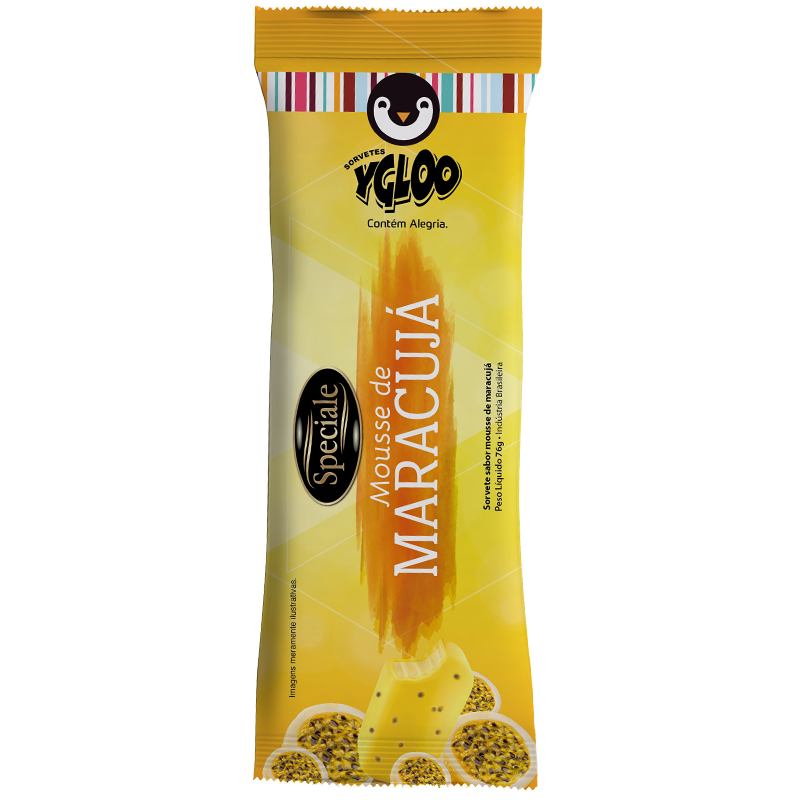 Sorvete sabor maracujá com cobertura de chocolate branco com aroma e sementes de maracujá.