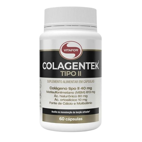 O Colagentek Tipo II C/60 cápsulas 750mg é um suplemento alimentar formulado para auxiliar na manutenção da saúde das articulações, promovendo mobilidade, conforto e proteção da cartilagem. Sua composição inclui colágeno tipo II não hidrolisado, MSM (metilsulfonilmetano) e ácido hialurônico, ingredientes essenciais para o suporte articular.