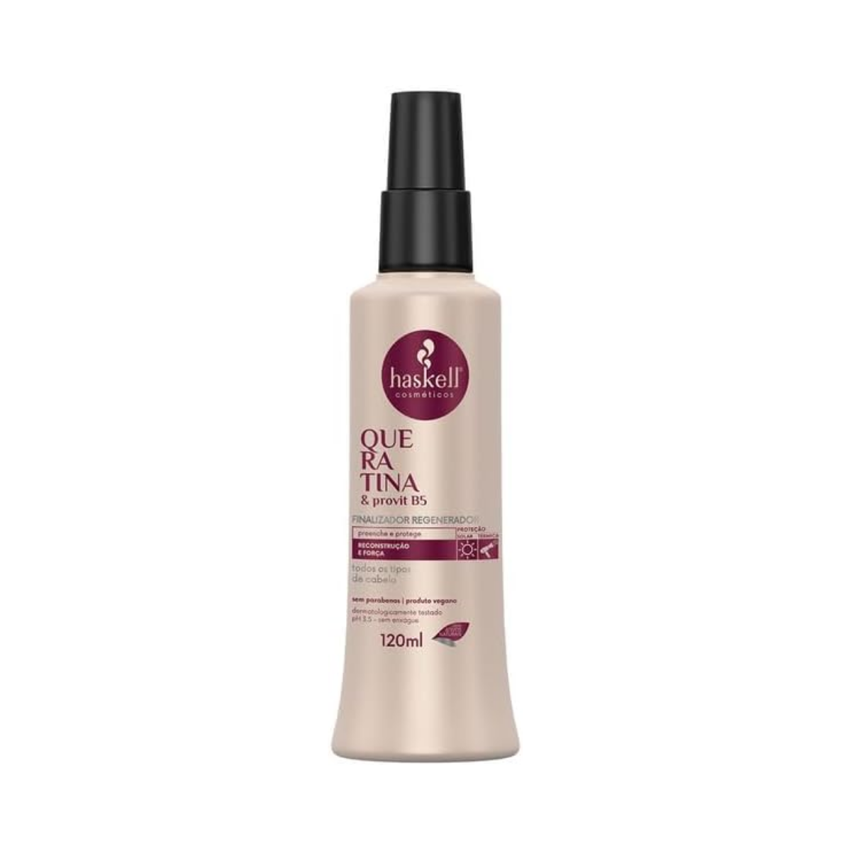 O Finalizador Regenerador Queratina & Provit B5 Haskell 120ml é um tratamento capilar desenvolvido para fortalecer, regenerar e proteger os fios contra danos térmicos e ambientais. Sua fórmula contém queratina vegetal e pró-vitamina B5, que ajudam a repor a massa proteica dos cabelos, proporcionando elasticidade, força e brilho intenso.