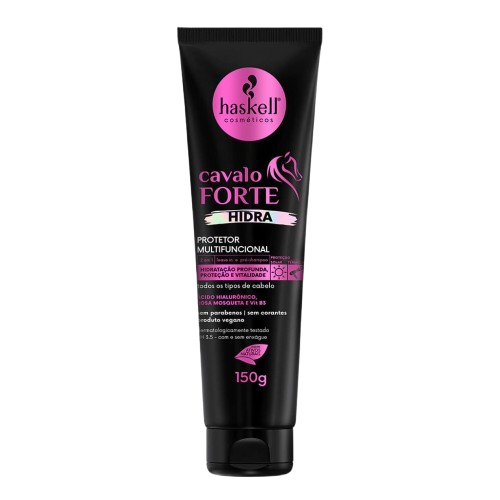 O Protetor Multifuncional Cavalo Forte Hidra Haskell 150g é um produto versátil, ideal para todos os tipos de cabelo. Ele pode ser usado como leave-in ou pré-shampoo, oferecendo hidratação intensa, proteção contra altas temperaturas e raios solares, além de reduzir o frizz e blindar os fios da umidade. Sua fórmula contém Ácido Hialurônico, Rosa Mosqueta e Vitamina B3, que agem profundamente na fibra capilar, promovendo brilho, força e maleabilidade.