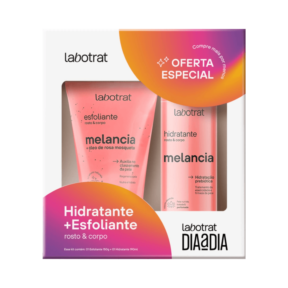 O Kit Labotrat Dia a Dia Melancia é composto por um hidratante de 190ml e um esfoliante de 150g, ideal para cuidados diários com a pele. Com a fragrância refrescante de melancia, este kit promove hidratação intensa e renovação celular, deixando a pele macia, suave e revitalizada.