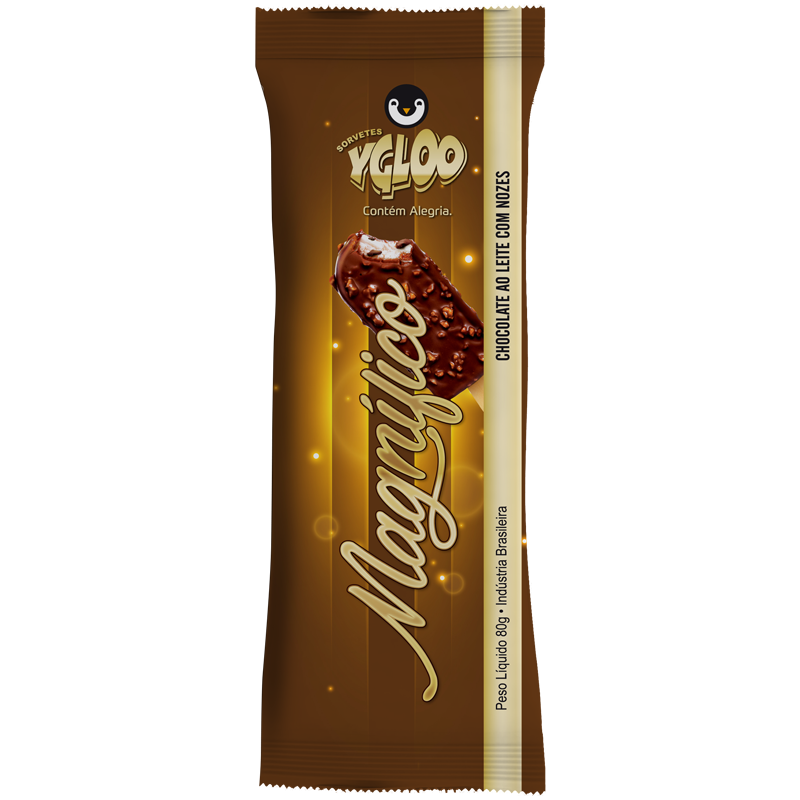 Sorvete com aroma de baunilha com cobertura de chocolate ao leite em barra derretido e um toque de nozes.